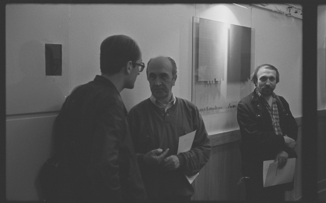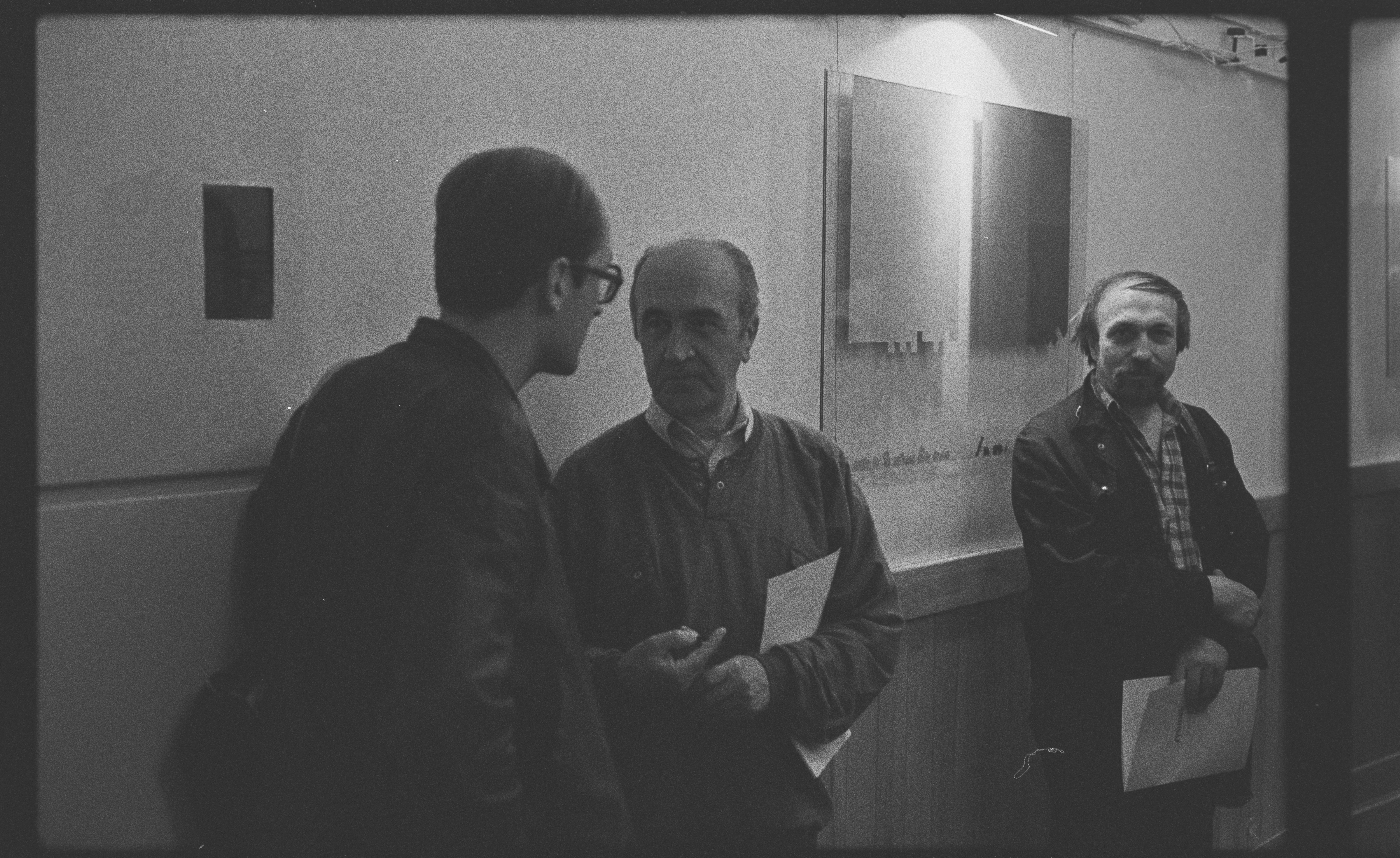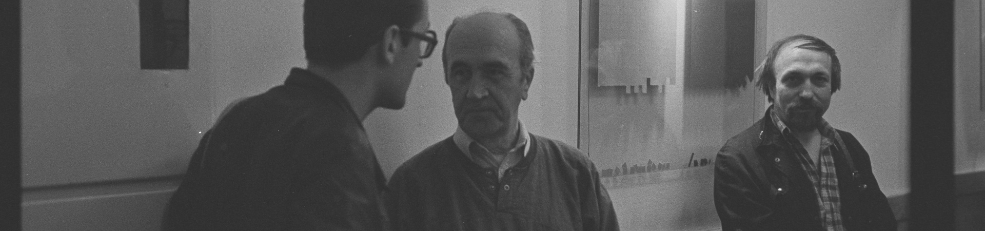 Janusz Bogucki (w centrum) z Piotrem Rypsonem podczas wernisażu wystawy "Rysunek (pokaz studyjny)" na drugim piętrze Zamku Ujazdowskim. Pierwszy od prawej - Fredo Ojda. Źródło: mediateka.u-jazdowski.pl
